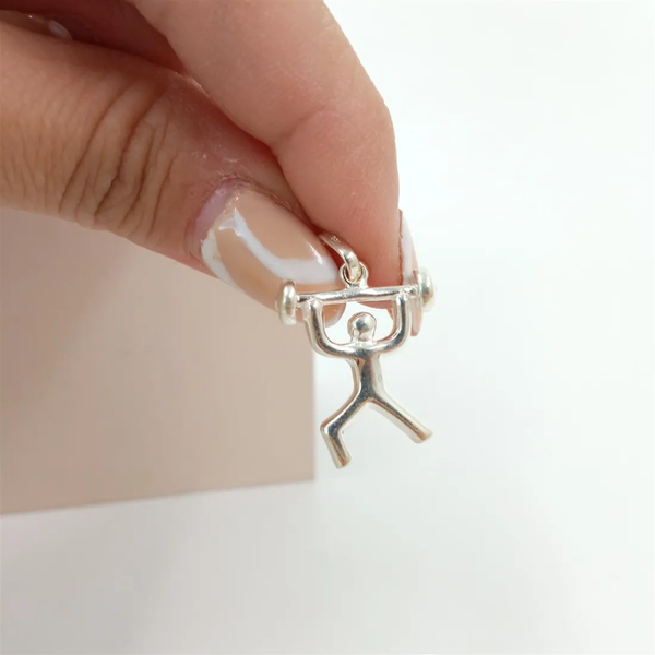 Dije de plata 925 con forma de persona levantando pesa. Medida aprox. 2 cm.